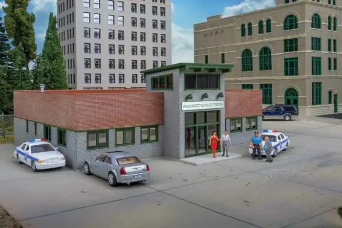 City or suburb, keep the peace in your HO community with the Cornerstone Modern Police Station kit! With a contemporary design perfect for the early 2000s to the present, the finished model is typical of facilties used by city, county and state police agncies all across North America. Similar buildings can be found in smaller communities where they serve as the village hall and local municipal building too! Other features include: