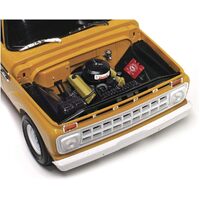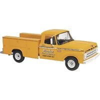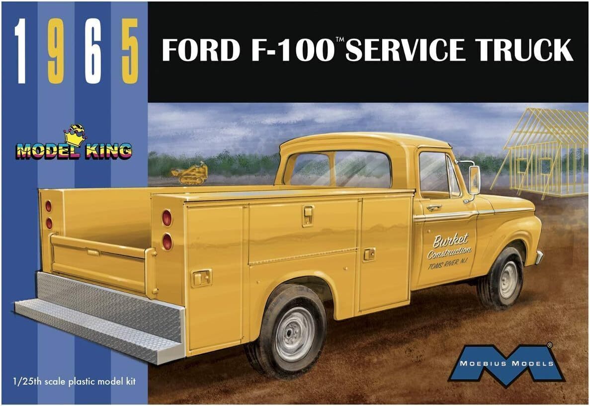 1965 Ford F-100 Service Truck. This is an all new kit of the classic American pickup from Ford. This kit features a352 cubic inch V8 Engine, utility bed, large door mirrors, decals for the work truck, chrome parts anddetailed interior.