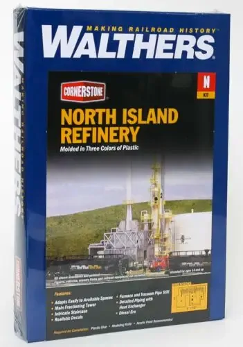 Bring oil industry traffic to your railroad with the Walthers Cornerstone North Island Oil Refinery kit. Railroads are vital to refinery operations, from the switchers that move cars, to the mainline freights that hustle finished products to market. This kit has been carefully designed to capture the realism of a prototype oil refinery in a size that works on most layouts. The kit includes a main fractionating tower, furnace, piping group and heat exchangers, vacuum pipe still and decal warning signs.