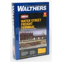 The Walthers Cornerstone Water Street Freight Terminal is an ideal addition to trackside scenes from the early 1900s into the 1970s and beyond. Freight terminals were essential to railroads, handling less-than-carload lot (lcl) shipments. Loads arrived in boxcars or reefers and were transferred to trucks for local delivery. Each railroad serving a community had its own terminal, usually near the main passenger station or classification yard. In the modern era these structures have been repurposed into everything from trucking terminals to restaurants. This detailed structure features a brick office building, freight house with loading docks to service freight cars and trucks, plus an assortment of crates, barrels and pallets.