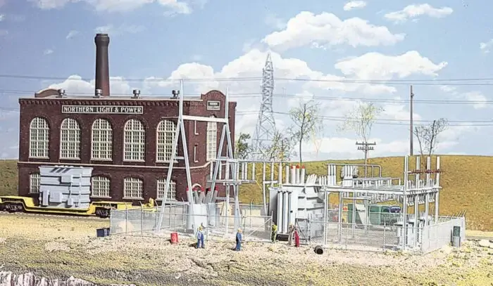 The Walthers Cornerstone HO Scale Northern Light and Power Substation is a must-have for adding authenticity to your electrical generation and distribution scenes. Substations are used to lower the current of high voltage before routing it to residential and commercial customers and can be found near generating stations, at large industries like steel mills and paper mills and as stand-alone facilities. This kit includes all the details of the prototype, from the transformers and steel framework to the chain-link fencing around the facility. Warning signs and billboard decals for the Cornerstone Basic Billboards frame kit are included. As shown the Northern Light and Power Substation kit measures: 8-1/2 x 12-1/2" 21.6 x 31.8cm