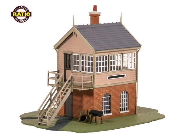 Although modelled on the signal box at Highley, Severn Valley Railway, this box was designed by the private signalling firm Mackenzie and Holland, making it suitable for many areas of the country. The Ratio Signal Box Interior kit 553 will provide a wealth of interior detail. Supplied with pre-coloured parts although painting and/or weathering can add realism; glue is required to complete this model. Footprint 92mm x 51mm inc. steps.