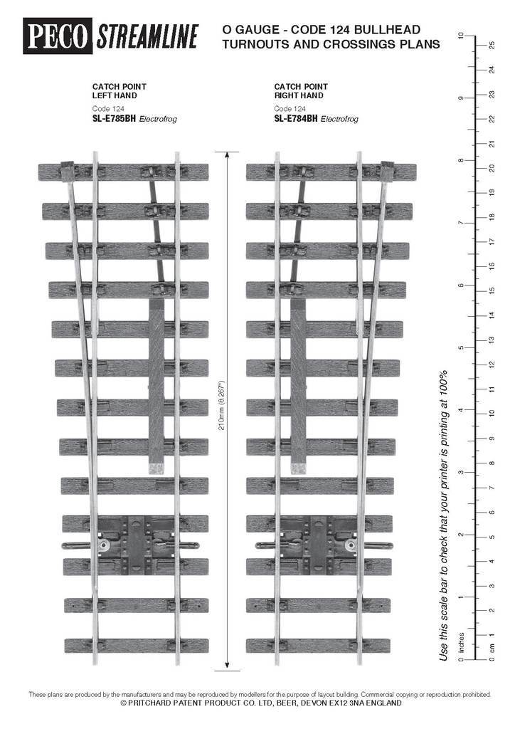 PECO STREAMLINE O CODE 124 BULLHEAD CATCH TURNOUT, LEFT HAND The purpose of a Catch Turnout is to derail a vehicle before it rolls out of a siding or branch line on to a main line. Peco Streamline Bullhead 0 Gauge track has set unsurpassed standards for 7mm scale realism. Superbly detailed, its 'wood grain' sleepers are the correct scale width and have integrally moulded scale chairs with square headed fixing bolts and wooden keys. This range is compatible with the 0 Setrack range; and if, as on the real network, you wish to use a combination of Bullhead and Flat Bottom track the SL-713 Transition Track provides an ideal way to connect the two types. Technical Specification: Length: 210mm