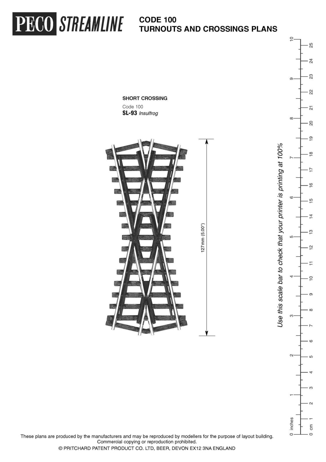 PECO STREAMLINE OO/HO CODE 75 CROSSING, SHORT The Short Crossing is double the angle of other track components in this range, this enables it to be used to form scissors formations in conjunction with them. Also, a compact double junction can be formed by using it with 2 short Y turnouts SL-E197 (Overall length 275mm). Peco Streamline Code 75 track meets the standards of enthusiasts who prefer to run trains on scale height rail. Today most manufacturers' wheels are suitable for use on Code 75 track but some vintage models may have flanges which are too deep to clear the rail fixings. Code 75 can be easily combined with code 100 track by using the SL-113 Transition Track. The wide range of turnouts and crossings in this series includes every type, and the geometry of this range has been cleverly designed to make it easy to build convenient, complex and aesthetically pleasing formations using combinations of small, medium and large radius turnouts and crossings. Layout plans suggestions can be found in our publications ‘Track Plans for Layouts to Suit all Locations’ (Ref PM-202), ‘60 Plans for Small Railways’ (Ref no PB-3), and ‘Track Plans for Various Locations’ (Ref no PB-66). For more details on Electrofrog turnouts, see our Wiring the Layout publications Nos 4 and 21. Technical Specification: Length: 127mm Frog Angle: 24 Degrees