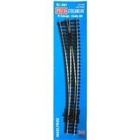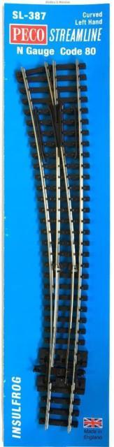 PECO STREAMLINE N CODE 80 CURVED TURNOUT, LARGE RADIUS, LEFT HAND - INSULFROG Curved Turnouts are extremely useful in overcoming awkward situations and providing alternative attractive formations on your layout. PECO Streamline N Gauge Code 80 - Universal trackage system This ever-popular trackage system for N offers a choice of either wooden or concrete type sleeper flexible track and a wide range of turnouts and crossings in both Insulfrog and Electrofrog types. Suitable for all makes of N Gauge trains and fully compatible with PECO Setrack. Technical Specification: Length: 160mm Frog Angle: 8 Degrees Radius: 457 x 914mm