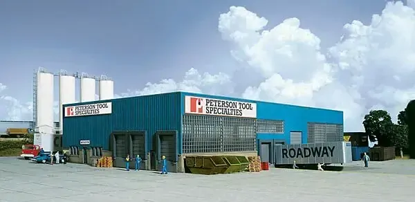 Modernize your industrial park with the Walthers Cornerstone Peterson Tool Specialties kit. With its steel and concrete construction, it can be used for almost any type of manufacturing operations. Sized to fit most layouts, the modular design makes it easy to construct a larger building by combining kits. Since today's industries depend on trucks and rail service, the kit includes doors and equipment for various types of loading docks. Large doorways for railroad cars make for interesting switching and can be adapted to hide an opening in your backdrop, or to model loads-in, empties out operations. The kit includes ground level truck freight doors (with a sloped ramp) along with conventional raised dock doors the same height as a trailer floor. Out front there's Peterson Tool Specialties main office area and a set of colorful signs are provided for the finishing touch.