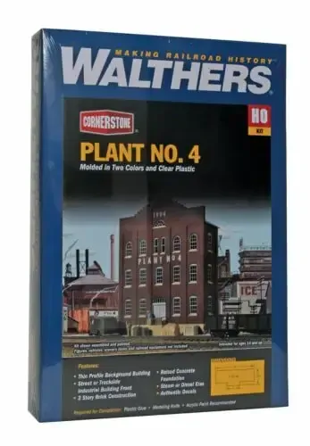 The Walthers Cornerstone HO Scale Plant No. 4 Background Building is perfect for making the most of the space between your rearmost trackage and backdrop. Just add it in front of a painted or printed backdrop to smooth the transition from foreground buildings and scenery. It can also be used as a stand-alone background building, or as part of a line of industries modeled with additional Background Buildings. Designed to fit between the track and your backdrop, it measures just over two inches deep. Complete with loading dock and decal signs Plant No. 4 is a great way to expand operations and put big detail in a small space.