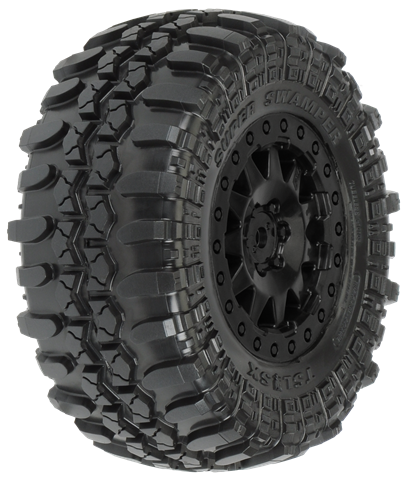 Proline Interco TSL SX Super Swamper SC 2.2/3.0 Tyres Mounted on F-11 Black Wheels This is a pair of pre-mounted Interco® TSL SX Super Swamper Short Course Tires. Pro-Line is bringing the popular Licensed Interco TSL SX Super Swamper Rock Crawling tread pattern to Short Course Size! This tire is perfect for adding to your Scale Short Course sized vehicle and also the new Traxxas Telluride. With “almost scale” not being acceptable and access to Interco’s design data, Pro-Line’s engineering staff has reproduced the Super Swamper in a scale configuration matched by none. The Super Swamper is a great All-Terrain tire that can handle dirt, gravel, mud, rocks and even the street – all while looking good doing it. Finish the look of your Scale Short Course off with one of Pro-Line’s popular True Scale bodies like the Ford Raptor SVT, Chevy Silverado HD, 1966 Ford F-100 and even our Desert Raid! The F-11 style wheel style that the Swamper tires are mounted on will bring the tough and rugged look of full-size trucks straight to your vehicle! This F-11 wheel will fit all ProTrac offset vehicles and features reduced webbing to properly fit the Losi SCTE 4x4 kit. The wheel features a molded-in bead-loc ring, 11 triangulated spokes and a scale P-L logo. This is a must have wheel for all Pro-Line SC fans! Tire Features: Interco TSL SX Super Swamper Replica Design Tackle tough terrain in Scale Style Perfect upgrade for your Traxxas Telluride Made in the Legendary M2 Compound Tire also available unmounted Wheel Features: Reduced webbing to fit Losi SCTE 4x4 Pro-Line ProTrac Zero offset wheel Tough 11-spoke wheel design Strong and Durable Nylon Material New P-L Racing Logo and Styling Wheels also available unmounted Made in the USA, since 1982 Fits: [F/R] ProTrac Slash 2wd [F/R] ProTrac Slash 4x4 [F/R] SC10 4x4 [F/R] TEN-SCTE 4x4 [F/R] SCT410 Please Note: These tyres are not designed to fit a stock Traxxas Slash, they require an extended wheelbase! Specs: Height: 4.30" (110mm) Width: 1.92" (49mm)