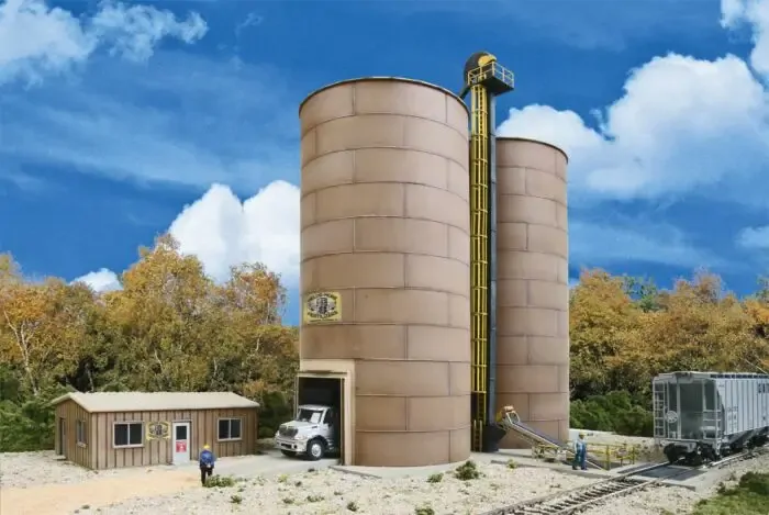 Wherever sand is offloaded, you'll find facilities like the prototype for the Cornerstone Rail-to-Road Aggregate Transfer. One of the newest industries along the rails involves some of the oldest material on earth - sand! While it's been used for centuries to make building materials, glass and metal castings, you'll also find it in paint, fertilizer and plastics. Recently, fracturing sand (or frac sand) has become a hot commodity, used to break rock and improve the flow at new oil and gas fields. But you can't use just any kind of sand for any kind of product, which means it's got to be hauled long distances from producer to end user - a big job tailor-made for today's railroads! Rail-to-Road Aggregate Transfers like this kit can be found at a wide range of industries, where they handle road salt, fertilizer and other granular materials. This complete, easy-to-build kit features twin storage silos with pull-through loading for trucks, main office and guard shack, plus printed company and safety signs.