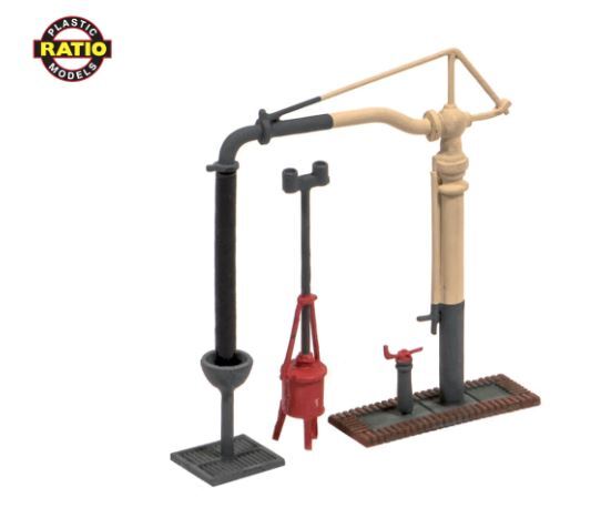 Stations often had these Water Cranes at the end of the platforms so the locomotives could be refilled without detaching them from the train. Also included is a coke brazier, called a 'fire devil' to keep the cast iron pipe from freezing up during the winter. These cranes were usually supplied by a large water tank (see Ratio Water Tower kits 215, 256 and Loco Servicing Depot kit 206). Supplied with some pre-coloured parts although painting and/or weathering can add realism; glue is required to complete this model.
