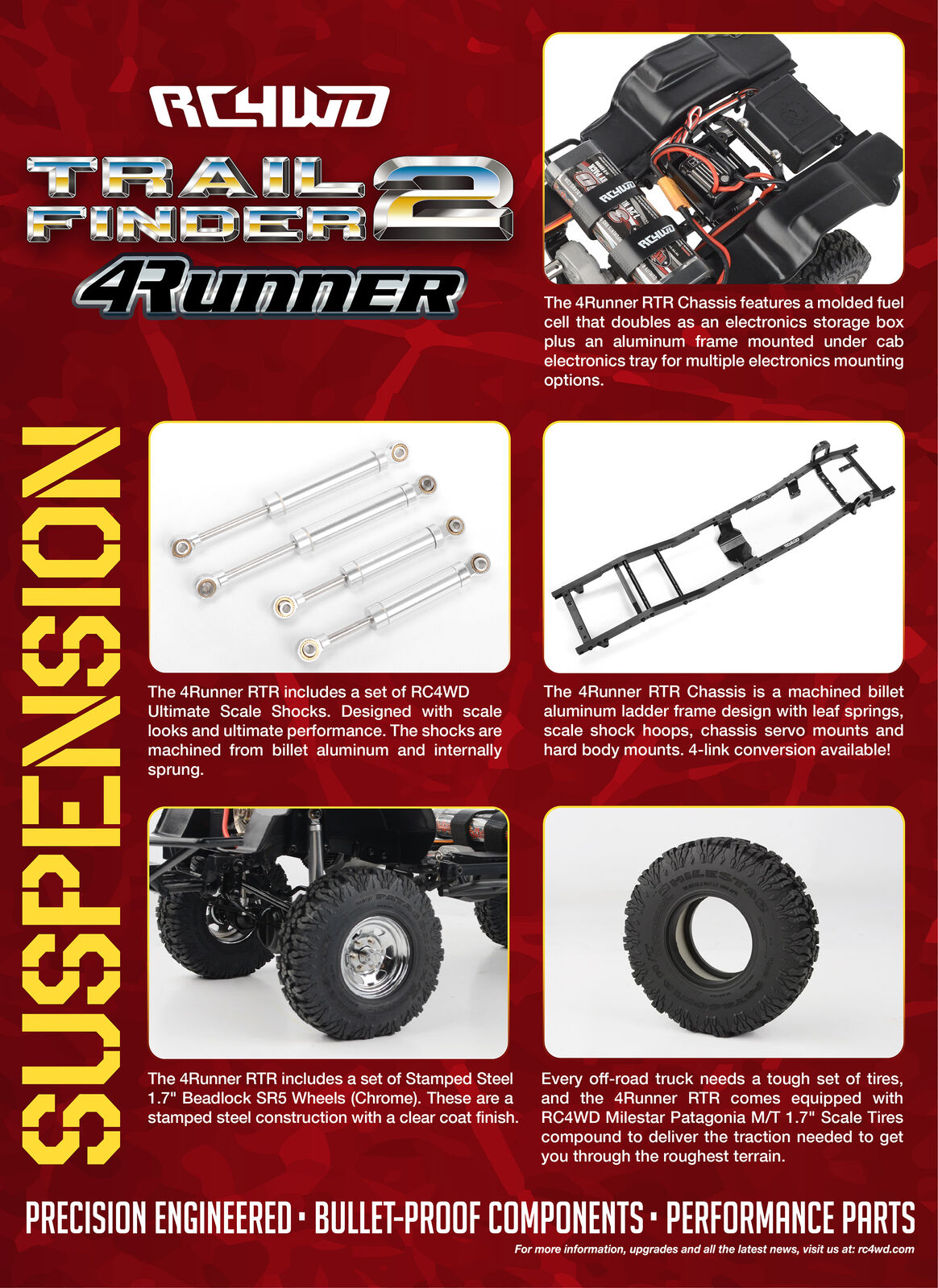 The 4Runner RTR features the popular RC4WD Outcry III Waterproof ESC Brushed Speed Controller with built-in drag brake for reliable, constant power on demand. Anytime.
