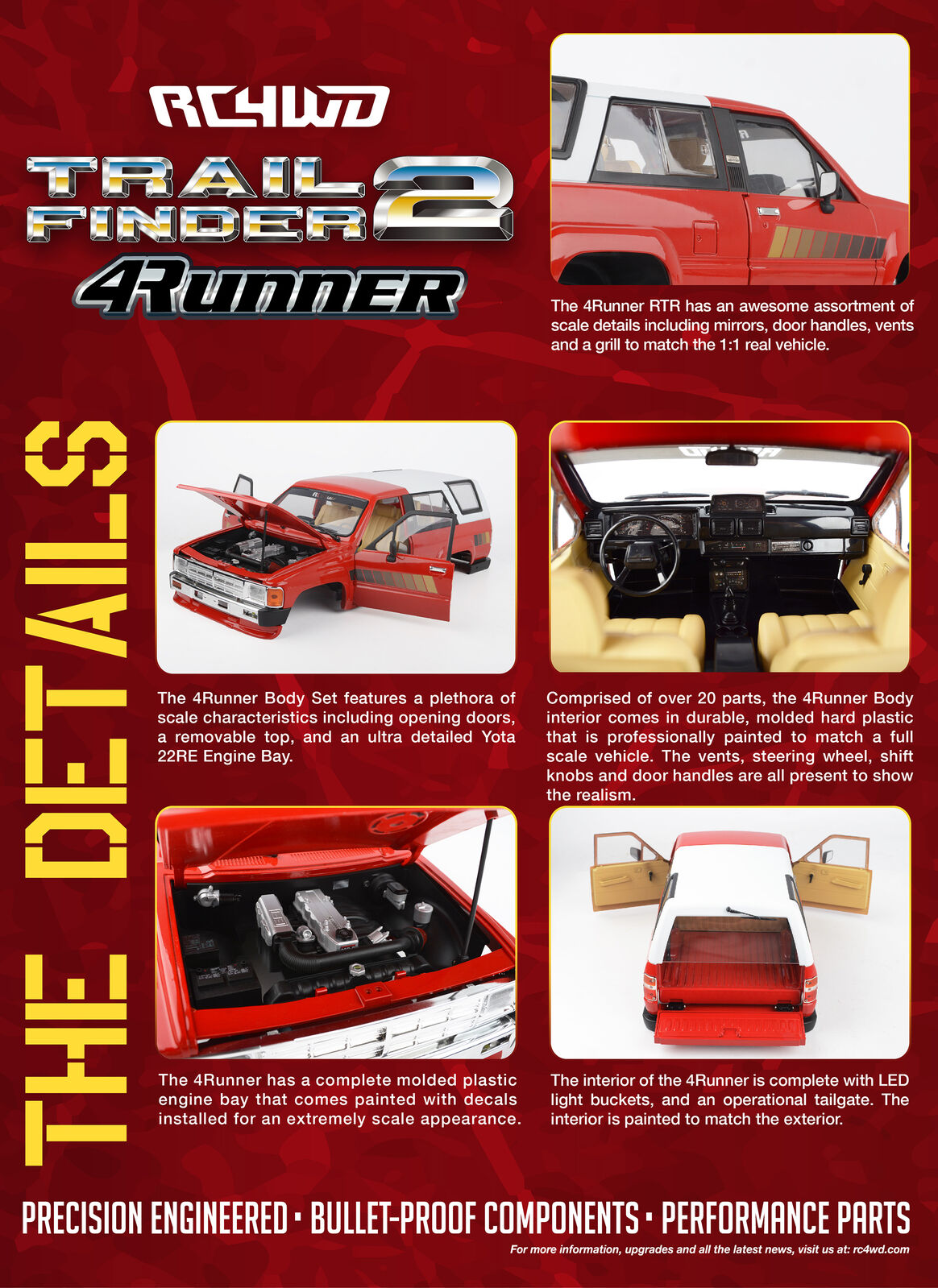 The 4Runner Body Set features a plethora of scale characteristics including opening doors, a removable top, and an ultra detailed Yota 22RE Engine Bay.