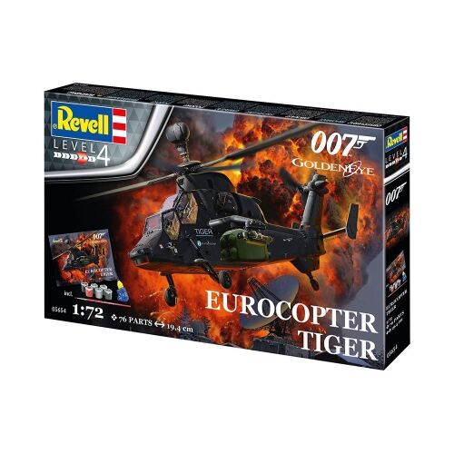 In the 17th James Bond film Golden Eye, the opponents of 007 steal the Tiger Eurocopter during a trial presentation in order to steal the weapon with the help of the top of the art helicopter. - Detailed fuselage halves - Movable main rotor - Authentic decals with familiar scenes from the film In addition to basic colours, adhesives and brushes are also included.