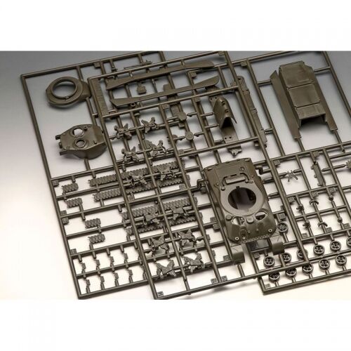 Model kit of the most manufactured US tank in the Second World War, the Sherman. Deficiencies in armour could be compensated for by the Shermans numerical superiority and great mobility. · Movable turret · Detailed surfaces Authentic representation of the following versions: - Sherman M4A1, unknown unit, german booty tank - Sherman M4A1, Company D, 66th Armoured Regiment, 3rd Armoured Division, "Spearhead" Division Operation Cobra, July 1944, Normandy Campaign
