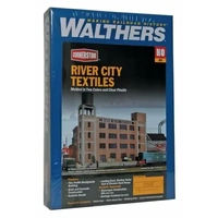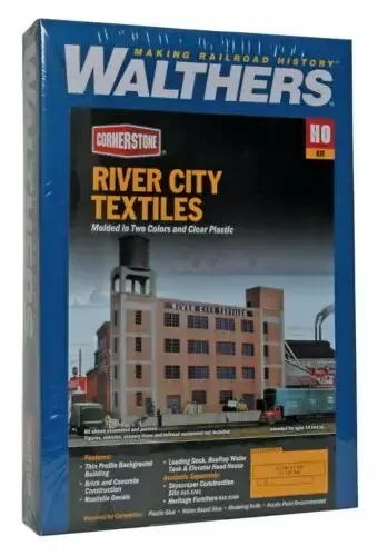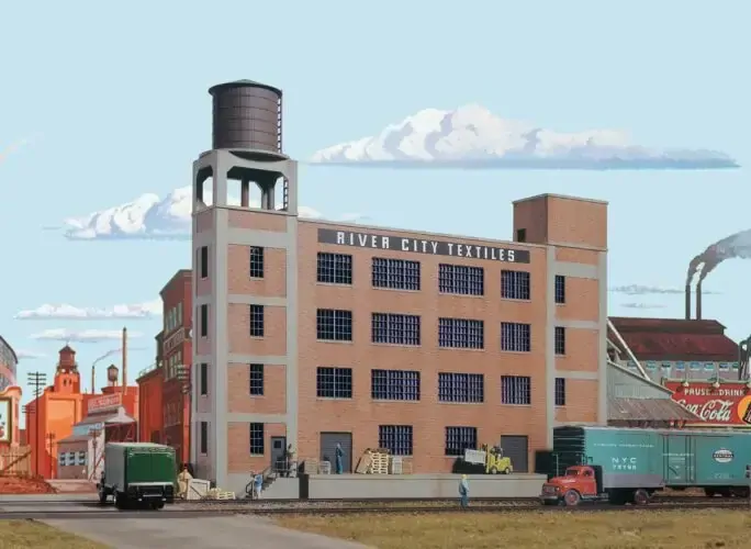 The Walthers Cornerstone HO Scale River City Textiles Background Building is a great way to add an industry to your layout between your rearmost tracks and your backdrop. The finished model gives the appearance of a full-size building behind other structures-even though it's only 2-3/8" deep. Like many big city buildings, this factory has a concrete freight car loading dock. Install a spur and add more operating fun to the small space between your layout and background scene.