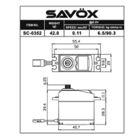 Savox Standard Digital Servo .13/90 @ 6V The Savox SC-0352 is considered a 'standard' servo, but outperforms other standard servos with more torque and dual bearing support. Features: Dual ball bearing support for precision and gear support. Industrial plastic gear train is quiet and smooth. More torque than other standard servos. Specifications: Torque @ 4 .8v - 4.2kg/58.3oz-in Torque @ 6v - 6.5kg/90.3oz-in Speed @ 4.8v - 0.14 sec/60 deg Speed @ 6v - 0.11 sec/60 deg Dimensions L x W x H (mm): 40.7 x 20.0 x 39.4 Weight: 42.0g Detailed Specs: Operating Temperature: 14° - 122°F (-10° - 50°C) Running Current (no load): 180mA @4.8V, 240mA @6.0V Stall Current (at locked): 1300mA @4.8V, 1500mA @6.0V Idle Current: 5mA @4.8V, 5mA @6.0V Wire Length: 250 +/- 5mm Output Gear Spline: 25 Tooth Bearings: 2BB Operating Travel: 120° (1000 → 2000 µ second) Neutral Position: 1500 µ second Pulse Width Range: 800 → 2200 µ second Maximum Travel: Appx 164° (800 → 2200 µ second) Refresh Rate: 240 Hz Motor Type: Brushed
