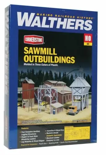 The Walthers Cornerstone Sawmill Outbuildings are perfect for adding to 1950s and later sawmill operations. This set of structures, designed as accessories for the Mountain Lumber Co. Saw Mill (933-3058, sold separately), includes four complete buildings, typical of the equipment installed at saw mills and other businesses that generate wood chips and waste. The Log Debarker is the first stop for logs heading into the mill. Inside, the bark is ground away, producing more useful timber with less waste material. A quick pass through the Wood Chipper reduces scrap lumber and bark into woodchips. The lightweight chips are blown through pipes to the chip loaders for shipment to paper mills and other users. The kit includes a Rail Car Wood Chip Loader with its special equipment for loading wood chip hoppers and gondolas, available separately. The Truck Wood Chip Loader comes complete with gravity-feed storage bin and blower details.