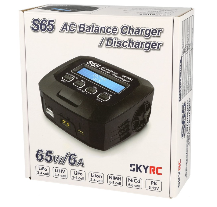 SkyRC S65 AC Balance Charger / Discharger 65W 6AMP Multi Chemistry SkyRC S65 AC Professional Charger/Discharger stands out for its angular design and compact size by packing a big power of 65 watts into such a small case. Compatible with a full range of the most popular battery types, including the new generation LiHV, the S65 keeps your batteries powered up with 6-amps of charging power. AGM & Cold Charge Modes for PB Battery SkyRC S65 can charge AGM battery and also can be used for charging PB battery at very low temperatures. Embedded XT60 Battery Connector By embedding the XT60 battery connector in the charger, it gets more convenient & safe for charging the most popular battery with XT60 connector and avoid the possibilities of reverse polarity for it. Smart & Efficient Cooling System Temperature controlled 7000rpm high speed sleeve bearing cooling fan effectively blows the air through the extruded aluminum heat sink, effectively cooling the device. Higher Accuracy with Three Decimals for Battery Voltage The charger firmware is highly optimized by displaying the battery voltage with three decimals during the process of charging & battery voltage measuring. Specs : LiFe/ Lilon/ LiPo/ LiHV/ NiMH/ NiCd/ PB batteries. For Pb battery, AGM Charge and Cold Charge mode are available. Input voltage: AC 100-240V Circuit Power: Max Charge: 65W Max Discharge: 10W Charge Current Range: 0.1-6A Disharge Current Range: 0.1-2A Current Drain for Balancing Port:Max 200mA Trickle Charge Current: NiMH/ NiCd 50-300mA & OFF LiPo/LiFe/LiIon/ LiHV Cells: 2-4S MiMH/ NiCd Cells: 6-8S Pb Cells: 6-12V Firmware Upgrade: NO