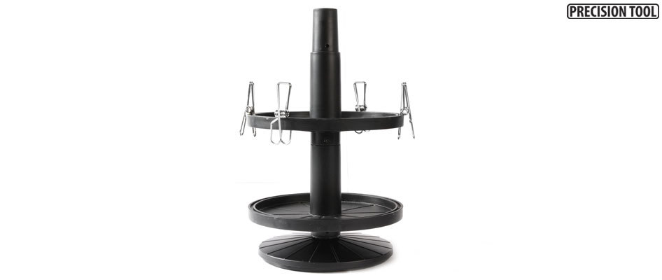 Rotating two-tier paint jar stand lets you organize your paints clearly for easy access. It can store up to 7 jars of acrylic "mini" (10ml) or 6 jars of 23ml paints per tray. Each tray has a small groove along its edge, allowing you to also use this as a drying stand simply by using alligator clips (4 included) to hold newly painted parts.