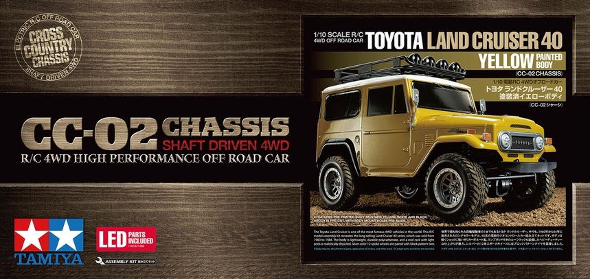 Tamiya This is a limited-edition version of the Toyota Land Cruiser 40 (Item 58715) kit with pre-painted, pre-cut body and wheel arches, great for not only beginners but also veterans. The Toyota Land Cruiser 40 has been a staple subject for Tamiya since 2008. It first appeared on the CR-01 crawler chassis then later the simpler CC-01 cross country chassis. Now, the classic Land Cruiser makes its way on to Tamiya’s newest cross-country platform, CC-02 with a few detail tweaks for the scale enthusiast! CC-02 Chassis - Off Road, Evolved Designed for a wide range of off-road scenes including rocky terrain, the CC-02 chassis' ladder frame is inspired by full-size vehicles and is the base for its superior durability. A 4WD setup employs the motor longitudinally behind the front axle with separated gearbox and transfer case, and propeller shafts transmitting power to the differential gears front and rear. Four-link rigid suspension is employed front and rear, with CVA oil dampers for all-encompassing control, even on tricky rock sections. This model comes with 12-spoke wheels and semi-pneumatic rubber tires. • 1/10 scale R/C model assembly kit. Length: 390mm, width: 198mm, height: 237mm. Wheelbase: 252mm (M-size wheelbase). • The CC-02 chassis is designed for a wide range of off-road driving expeditions and has a ladder frame which was inspired by full-size vehicles. • NEW: A roof rack with light pods is realistically depicted with separately molded parts. • NEW: Silver color 12-spoke wheels are paired with block pattern tires. (Wide wheels are included to recreate the customized look of this version.) • Includes Pre-Painted body in yellow. Note: Body stickers and assembly of accent parts need to be done by the assembler. • NEW: New stickers feature integrated tinted window and window frame sections to allow ease of applying stickers and eliminate the need for painting the window tint. • Includes Motor • Requires ESC, 2-channel radio, steering servo, 7.2-7.4volt battery with compatible charger.