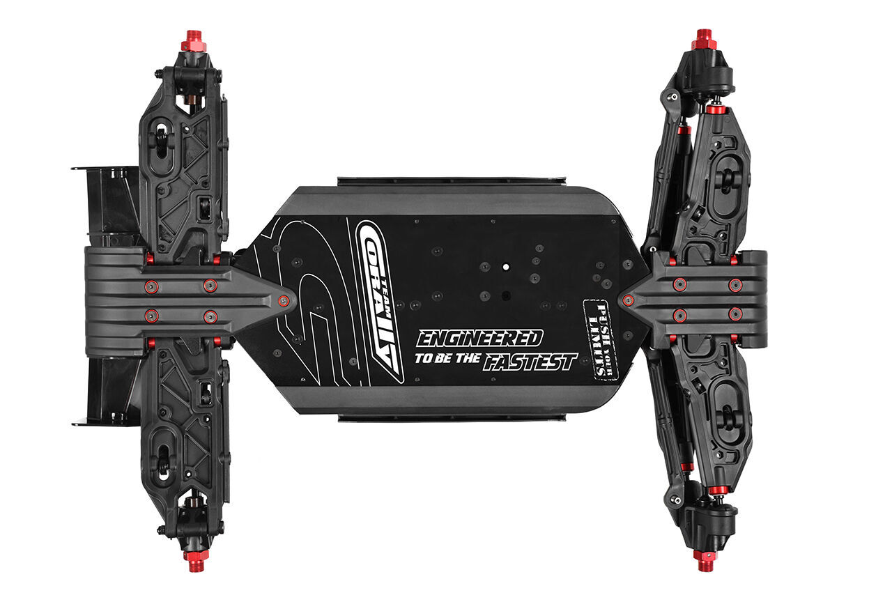 At the core of this drivetrain are CNC bevel gears, a vibrant red anodized aluminum central diff case, and robust spring steel outdrives – a symphony meticulously orchestrated for unyielding power and longevity. And in the world of monster trucks with oversized tires and wheels, the features of this robust drivetrain are magnified even more!