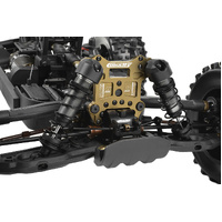 At the heart of the Kagama Limited Edition is its uncompromising 7075 aluminum backbone - a foundation engineered for extreme durability and precision handling. The gold-anodized 7075 aluminum chassis not only provides unmatched strength but also delivers an exceptional style. To further reinforce the structure, CNC-machined 7075 aluminum bulkheads lock the drivetrain in place, preventing unwanted movement and ensuring smooth, reliable power delivery, even under extreme loads. Meanwhile, the 6mm 7075 aluminum shock towers, paired with the new shock standoffs, provide rock-solid suspension support, allowing the proven Kagama shocks to absorb impacts consistently - no matter how hard you push the truck. Additionally, the 7075 Aluminum Servo Saver Bell Crank enhances steering precision and durability, ensuring direct and responsive handling in any driving condition.