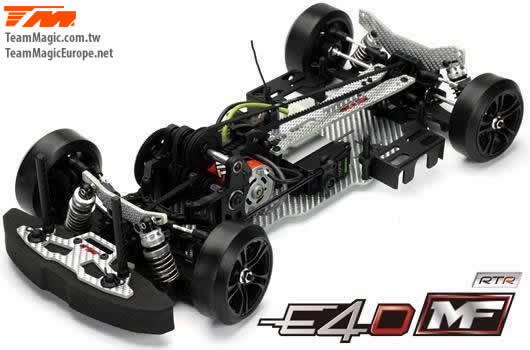 Become a Pro Drift pilot with the Team Magic E4D-MF! The Team Magic E4D-MF design offers a perfect weight balance for better control, is equipped with special CVD drive shafts in the front to increase the steering rate and also offers countersteer option in the transmission center to adjust individual RPM rating in front or at the rear. The lower and upper deck is made from durable silver carbon fiber material and the car comes fully equipped with ball bearings for free movement. Supplied fully built this car includes a wheel radio fully installed. You will need to add a battery and charger to complete this setup. We recommend 2s Lipo batteries or 7.2v Ni-MH batteries. Talk to our friendly staff for a custom setup. E4D-MF RTR Features: -Full Ball Bearings -3 Belts Transmission -2.5mm Silver Eco Graphite Chassis -2.5mm Silver Eco Graphite Upper Deck -2.5mm Silver Eco Graphite Shock Towers -Fully Adjustable Turnbuckles -Quick Release Battery Holder -H.A.R.D. 2.4gHz Radio System -H.A.R.D. Electronic Speed Controller -H.A.R.D. X3 Motor -Finished Drift Car Body with smart Matt Finish E4D-MF RTR Main Specs: -Width: 186~193mm adjustable -Wheelbase: 256~260mm adjustable -Transmission: Front Oneway / Rear Spool -Countersteer: 64% (Rear 0.8 / Front 2.06