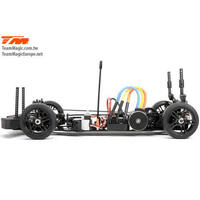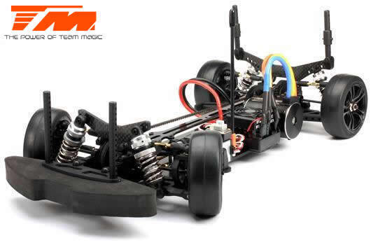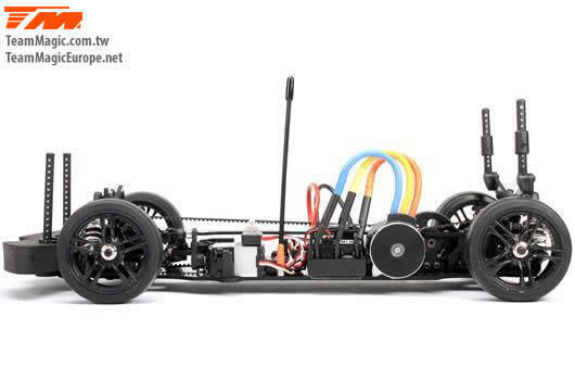 With the Team Magic E4RS III's competitive success (multiple national champion, ETS finalist etc.) and the E4JS II's huge commercial success, the Team Magic E4 chassis was the "car of the year 2014" in numerous clubs. Team Magic built on that success and developed the E4JS II in order to reduce it in an optimized RTR version. A new part that transforms the front differential into a spool (rigid axle), new battery mounts that allow the use of batteries with rounded shape (NiMH or LiPo) and simplified a number of parts in order to maintain an ultra-competitive price (lower chassis, shock mounts and motor mount), all this supplied with excellent electronics (servo, receiver and speed controller!). The result is the E4JR II, the most competitive and innovative RTR car on the market! Supplied with a 2 channel radio, just add battery and charger. The features inherited from the E4RS III: Team Magic utilised numerous elements and parts of the E4RS III to create the E4JS II, which is so in no way a touring car of reduced quality. -Identical suspension geometry to the E4RS III -Centred and aligned weight -Hard suspension arms, uprights and caster blocks -7075 Aluminium hard-coated spur gear holder -Low-Friction belts -Adjustable belt tension via eccentrics -Gear differential with 4 composite gears -Low Friction ball bearings -Ultra free pivot balls and ball cups with minimized play -Heavy duty body posts -High density foam bumper The features inherited from the E4JS II: The E4JS II is "THE" club racer car reference (a club racer is a confirmed driver, demanding a high quality level, but which wants to keep a reasonable budget and to limit himself to regional championships). -2.0mm ECO-Graphite upper deck -High quality constant volume shock absorbers -Matched and optimized shock springs for TC -Hard plastic lower bulkheads -Hard plastic upper bulkheads -ST hardened steel suspension shaft -Hard plastic ball raced steering bell crank -Hard plastic centre layshaft mounts -High Quality 48DP spur gear -Steel differential / spool outdrives for an extreme durability -Universal driveshafts