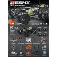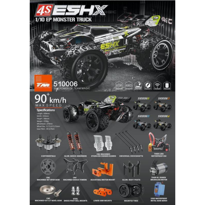 The designers at Team Magichave long been known for reliable and durable cars and the E5 HX+ is no exception. Now capable of taking a 4S battery, the new HX+ pushes the limits of 1/10 monster trucks at up to 90Kph!