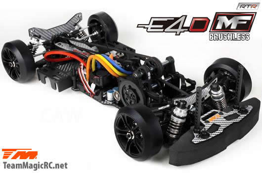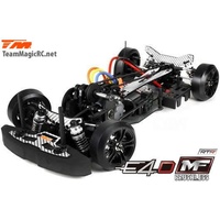 Team Magic Become a Pro Drift pilot with the Team Magic E4D-MF! This version is factory fitted with a 5750Kv 6.5t brushless motor for maximum power and control. The Team Magic E4D-MF design offers a perfect weight balance for better control, is equipped with special CVD drive shafts in the front to increase the steering rate and also offers countersteer option in the transmission center to adjust individual RPM rating in front or at the rear. The lower and upper deck is made from durable silver carbon fiber material and the car comes fully equipped with ball bearings for free movement. Supplied fully built this car includes a wheel radio fully installed. You will need to add a battery and charger to complete this setup. We recommend 2s Lipo batteries or 7.2v Ni-MH batteries. Talk to our friendly staff for a custom setup. E4D-MF RTR Features: -Full Ball Bearings -3 Belts Transmission -2.5mm Silver Eco Graphite Chassis -2.5mm Silver Eco Graphite Upper Deck -2.5mm Silver Eco Graphite Shock Towers -Fully Adjustable Turnbuckles -Quick Release Battery Holder -H.A.R.D. 2.4gHz Radio System -H.A.R.D. Electronic Speed Controller -H.A.R.D. X3 Motor -Finished Drift Car Body with smart Matt Finish E4D-MF RTR Main Specs: -Width: 186~193mm adjustable -Wheelbase: 256~260mm adjustable -Transmission: Front Oneway / Rear Spool -Countersteer: 64% (Rear 0.8 / Front 2.06