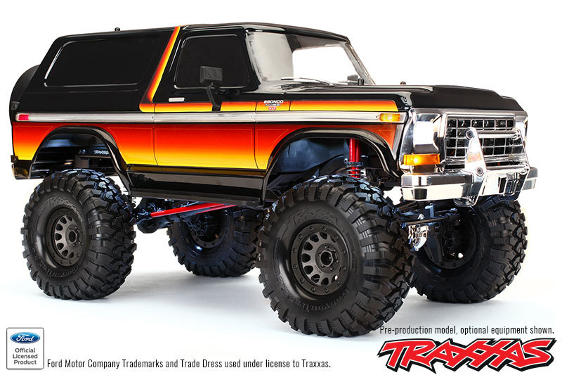 Traxxas TRX-4 Bronco - Sunset Edition 1/10 Scale and Trail Crawler Originally introduced in 1966 as a 4x4 compact SUV, the Ford Bronco matured as a full-size truck in the late 1970s, cementing its status as a rugged off-roader. Traxxas honors the classic 1979 Ford Bronco with this beautifully detailed and faithful reproduction mounted on the incredibly capable TRX-4 chassis. From the chrome wheels and bumpers to the gorgeous Sunset or red graphics, the TRX-4 recaptures the Bronco’s iconic era with the toughness and technology that could only come from Traxxas. With a host of features not found on any other crawler on the market, the TRX-4 is our go to weekend warrior. 4 channel TQI radio controller installed as standard. Hi/Low gear transmission selectable from the radio controller. Locking differentials front and back selectable from the radio controller Portal axles for greater ride height and clearance Requires: 7.2v - 11.1v Battery Suitable Charger 4 x AA's (For Transmitter)