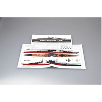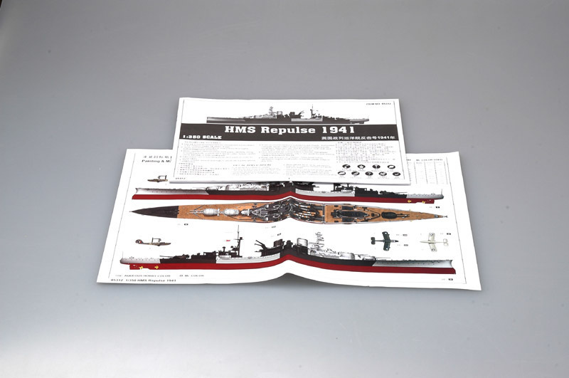 HMS Repulse, a Renown class battlecruiser, was built in Scotland, completed in August 1916. Repulse received an extensive refit. The work was completed in 1922. In 1933-36, Repulse was again modernized, emerging with improved deck armor, a hangar and catapult for aircraft, and a greatly increased anti-aircraft gun battery. She operated with the Home Fleet in the North Sea and Atlantic during the first two years of the Second World War, taking part in the pursuit of the German battleship Bismarck in May 1941.Later in the year she was sent to the Far East, accompanying the new battleship Prince of Wales. The two ships arrived at Singapore just before Japan began the Pacific War. As soon as hostilities commenced, both steamed northwards to intercept a reported invasion force.While returning to Singapore, Repulse and Prince of Wales were attacked by Japanese high-level bombers and torpedo planes. Repulse was moderately damaged by bombs early in the action and was later hit by several torpedoes. After receiving this heavy underwater damage, she sank rapidly, followed less than an hour later by the Prince of Wales.