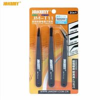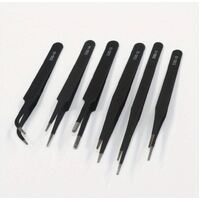 A pair of stainless steeltweezers, one straight and one bent nose.
