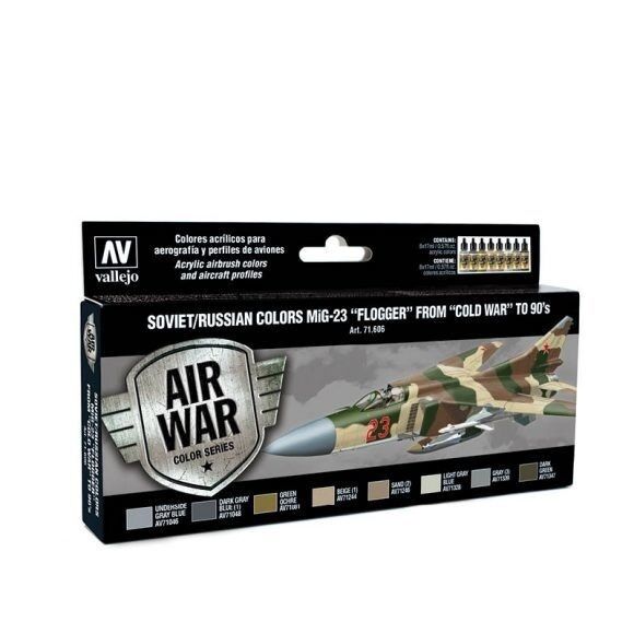 Set with Model Air color developed to paint the different models of the MiG-23 “Flogger” of the Soviet Air Force deployed during the “Cold War”. The set includes profiles of the aircraft, indications of the colors needed and a detailed description of their application.