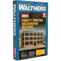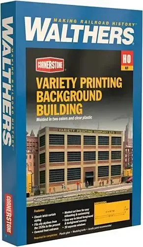 The Walthers Cornerstone Variety Printing Background Building is typical of concrete industrial buildings found in commercial and manufacturing districts in cities across the continent. This thin-profile curtain-wall Background Building is designed for use between your rear streets and painted or printed backdrop to create a realistic transition from layout to background. A covered loading building entrance, colorful decals and complete instructions round out the Variety Printing Background Building kit.
