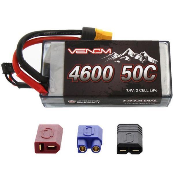 Lithium Polymer crawler battery 7.4v 4600mah with Venom Uniplug system. Includes Traxxas, XT60, Deans and EC3 plug adapters. approximately 95x45x22mm