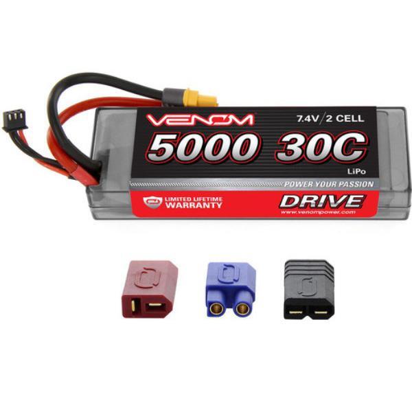 Lithium Polymer battery 7.4v 5000mah with Venom Uniplug system. Includes Traxxas, XT60, Deans and EC3 plug adapters. approximately 135x45x22mm