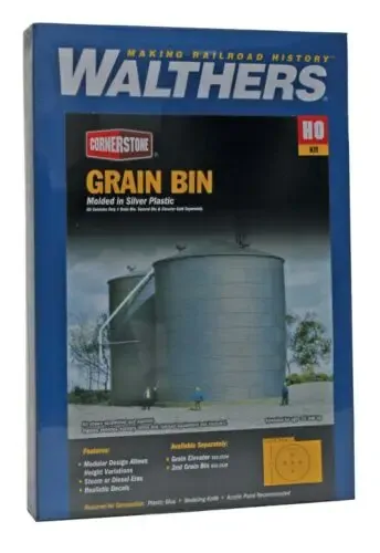 The Walthers Cornerstone HO Scale Big Grain Storage Bin is based on structures found at elevators, feed mills and on farms across the continent. Featuring realistic corrugated-metal construction complete with panel lines, grain bins can be used alone or with all kinds of Walthers Cornerstone grain handling structures. Typically, grain bins are connected to other structures with the Grain Conveyor (933-3124, sold separately).