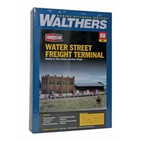 The Walthers Cornerstone HO Scale Water Street Freight Terminal is an ideal addition to trackside scenes from the early 1900s into the 1970s and beyond. Freight terminals were essential to railroads, handling less-than-carload lot (lcl) shipments. Loads arrived in boxcars or reefers and were transferred to trucks for local delivery. Each railroad serving a community had its own terminal, usually near the main passenger station or classification yard. In the modern era these structures have been repurposed into everything from trucking terminals to restaurants. This detailed structure features a brick office building, freight house with loading docks to service freight cars and trucks, plus an assortment of crates, barrels and pallets.