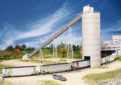 The Walthers Cornerstone Western Coal Flood Loader puts big action in a small space on your railroad. With today's "just in time" coal delivery, meeting customer schedules demands equipment that's up to the job. Based on large-silo coal loaders, flood loaders like this are now used in both eastern and western coalfields. Essentially storage silos that hold tons of coal for quickly loading unit train gondolas and hoppers, these large structures are fed by conveyor systems from mines and coal processors or washers that can be miles away - perfect for adding a large industrial shipper along your railroad without modeling the huge associated mine shaft or pit - it's implied it's somewhere off the layout! The Western Coal Flood Loader includes a variety of rooftop machinery that puts realistic detail in this highly visible location. Modular conveyor sections can be arranged in a variety of ways, or combined with other buildings like the New River Mining Company, (933-3017) or Glacier Gravel (933-3062, this structure is similar to a coal crusher-grader) to model a complete scene. Stackable loading silo sections allow you to easily build a tall or short structure that can fit wherever overhead clearance may be limited, such as on multi-deck layouts.