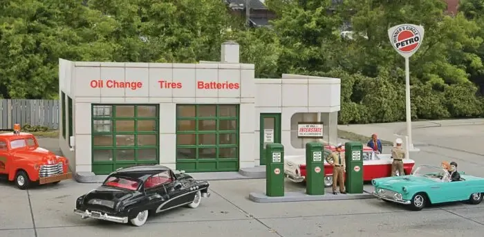 Authentic styling looks great on any vintage or modern street scene. Three styles of pumps are included to match your era, along with colorful decal signs for the finishing touch.